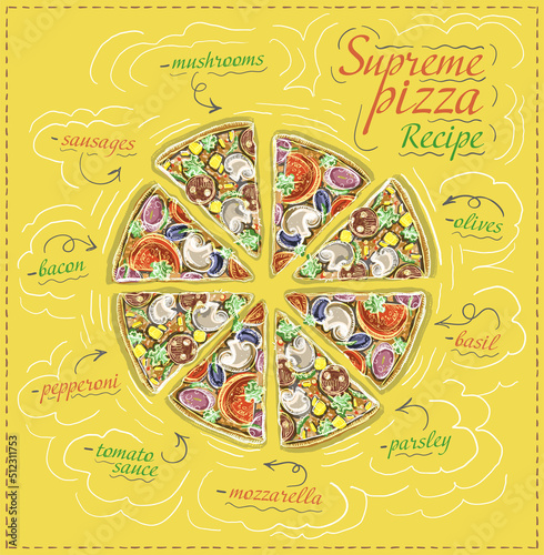 Supreme pizza recipe poster, vector sketch style illustration