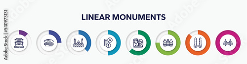 infographic element with linear monuments outline icons. included hall of supreme harmony, dprmpr building, chartres cathedral, dollar coins, holy family, holstentor, thermometers, zakim bridge