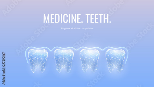 Website template. Human tooth anatomy translucent low poly triangles. Futuristic glowing organ hologram on dark blue background. Medical innovation diagnosis treatment concept. Banner vector.
