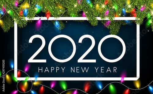 Blue shiny 2020 New Year banner. Bokeh effect.