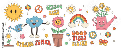 Groovy hippie 70s set. Funny cartoon flower, rainbow, peace, Love, heart, daisy, mushroom etc. Sticker pack in trendy retro psychedelic cartoon style. Isolated vector illustration. Flower power.