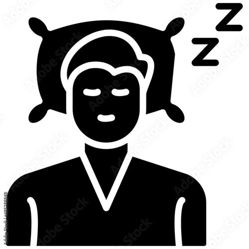 Solid style icons of sleep and rest: sleep mask, moon with stars, bedtime icon, alarm clock, sleep tracker, night routine, bedtime book, rest zone.