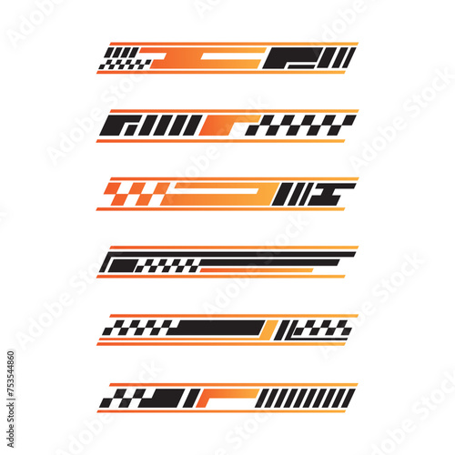 Dynamic racing stripe graphics kit. Collection of abstract vector decals and checkered flag designs for vehicle customization.