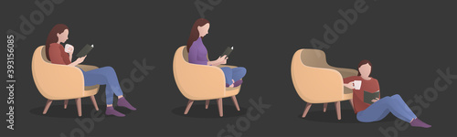 Book club concept. Men and women read. Love for literature, education and self development. Useful hobby and leisure. Back to school and livrary, homework. Cartoon flat vector illustration