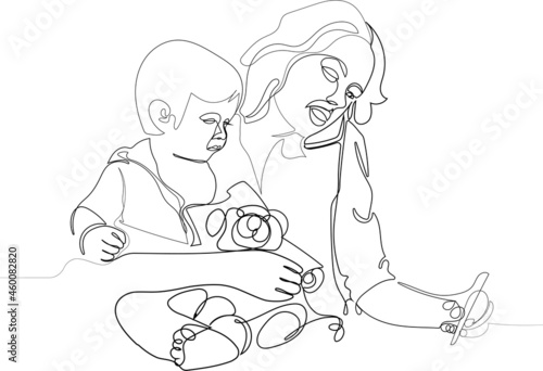 The child is busy with the nanny while mom is working. Flat cartoon vector illustration.
