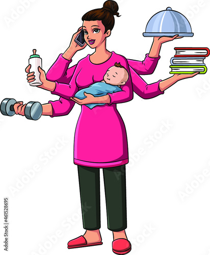 Cartoon vector illustration of a mom multi-tasking