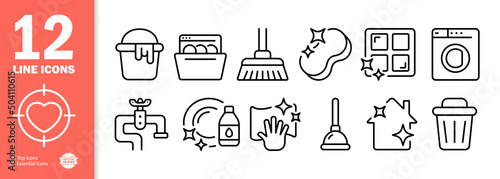 Housework set icon. Paint bucket, dishwasher, mop, broom, soap, powder, window, washing machine, detergent, garbage, cleanliness, etc. Vector line icon for Business and Advertising