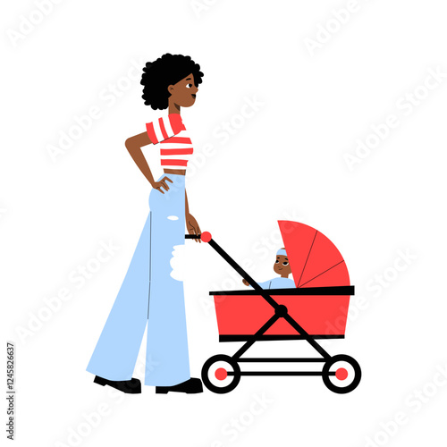Stylish Mother Walking With Baby In Stroller In Flat Vector Illustration Symbolizing Parenting, Childcare, And Modern Motherhood, Isolated On White Background