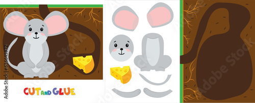 Vector illustration cute animals in hole. Blank burrow. Feed cheese Worksheet for toddler. Busy quiet  book for 1-4 years. Printable page, build the little mouse. Mom cuts, baby glues it. Simple image