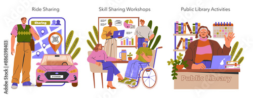 Flat vector icons of inclusive transportation: wheelchair lift in bus badge, accessible metro station trophy, low-floor tram medal, tactile map for navigation ribbon, inclusive ride-sharing option