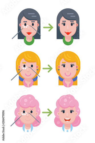Vector Illustrated set of girls getting salon 3D volume eyelash extensions.