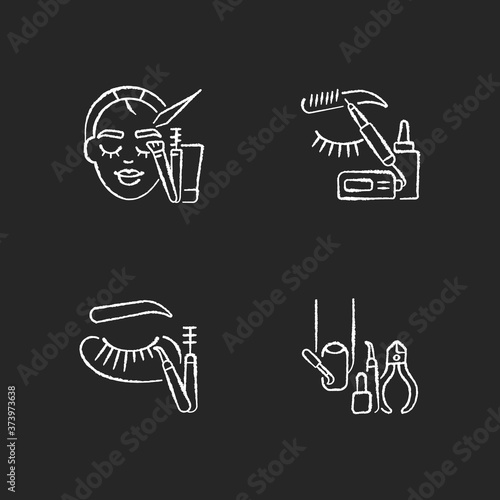 Face care chalk white icons set on black background. Manicure. Microblading. Eyelash extension. Nail varnish. Eyebrow lamination. Beauty procedure. Isolated vector chalkboard illustrations