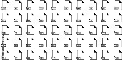 file format icons set. Set of pdf, doc, mp3, mp4, eps, png, html, txtweb format information. File symbols collection. multimedia data symbols. File types with document extension