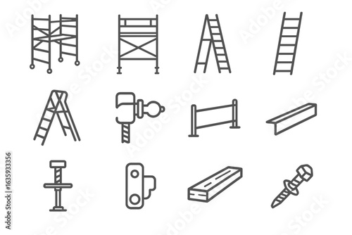 Scaffold and Ladder Icons. Line style icons of scaffolding and ladders: mobile scaffold, fixed scaffold, ladder icon, extension