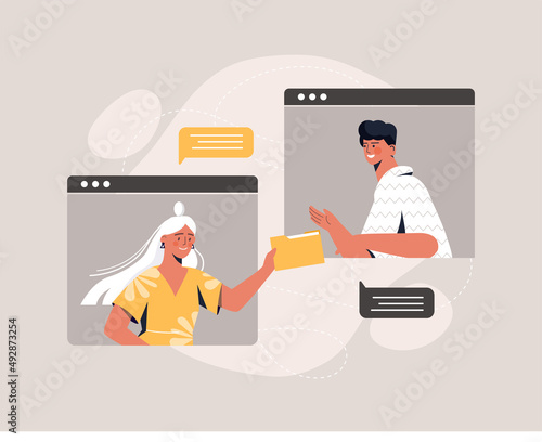 concept of file transfer, data backup, document storage, cloud technology, upload and download, business characters transferring files between devices, flat vector illustration on background.