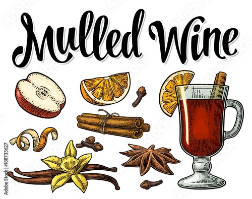 Mulled wine with cinnamon stick, lemon and star anise stock vector illustration.