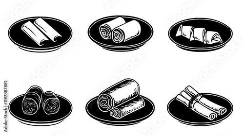 Monochrome Mexican enchilada set vector with meat and rolled tortilla for logo or emblem. Latin traditional enchiladas collection for restaurant or cafe of Mexico fast food