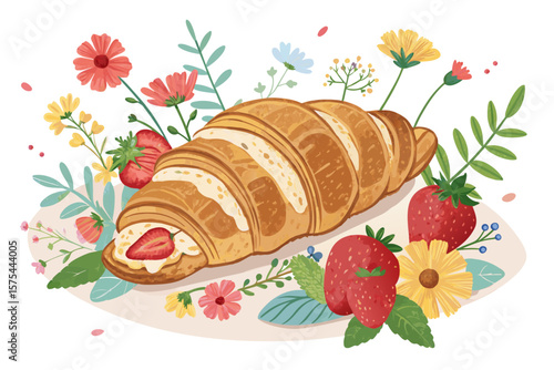 vector of Sweet breakfast: black coffee, croissants and a roll with raisins