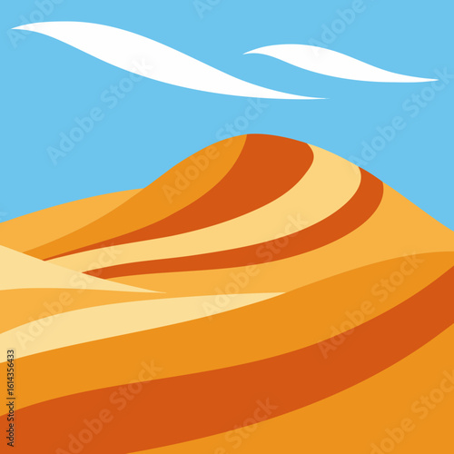 Vast desert landscape featuring rolling sand dunes under a clear blue sky. Peaceful and endless scenery with soft golden sand and warm sunlight creating a tranquil atmosphere, vector illustration