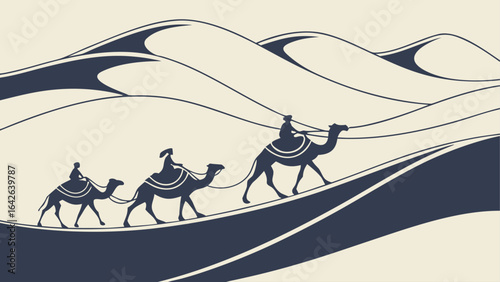 Silhouette of camels and dwellings under a starry sky in a desert landscape with rolling dunes scene