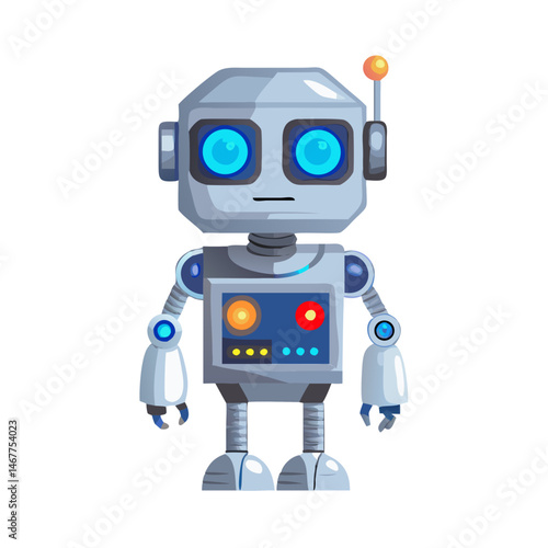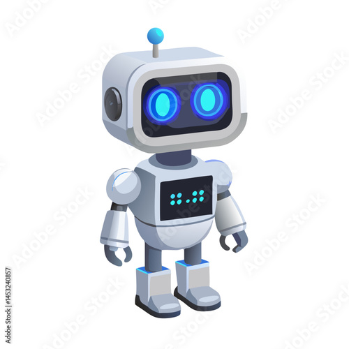 Illustration of a futuristic humanoid robot with white and blue accents, standing against a solid blue background.