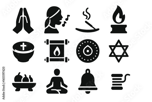 Religious Symbol Icons. Solid style icons of religious and spiritual traditions: prayer hands, sacred chant, incense holder, altar