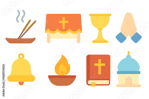 Religious Objects Icons. Flat vector mini-illustrations Religious holy place objects in colors children's illustrations: incense
