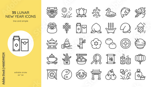 Lunar New Year Icon Set. Dragon Mask, Firework Cracker, Lotus, Koi, Fortune Charm, Temple Incense Burner, Longevity Peach, Pagoda, Sakura, Lucky Coin. Editable Vector Tet Festival Signs Collection.