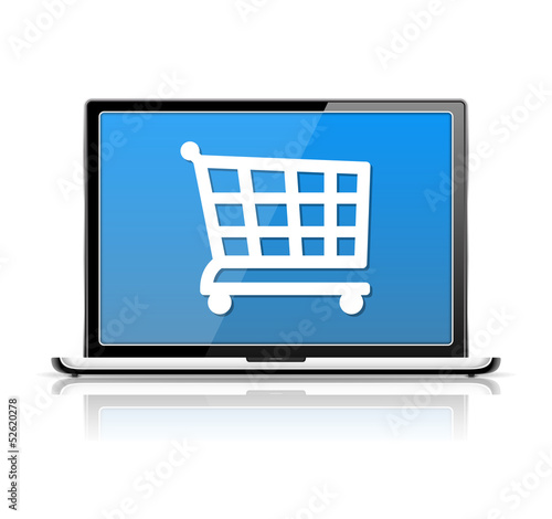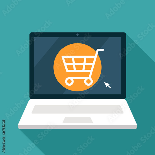 Online shopping via laptop, online store discount, paper bags parcel box, credit card and Sale 3d text on cart