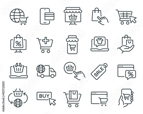 E-commerce icon set with shopping basket, ecommerce, online payment, online shopping, discount, buy, shopping bag, store, shopping bags icon. Simple line vector
