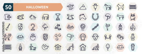 halloween outline icons set. linear icons sheet included rocker horse, jockey hat, coffin vector.
