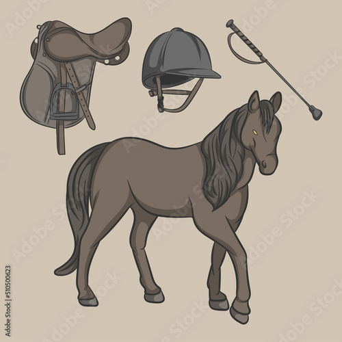 Big set of equipment for the rider and ammunition for the horse rider on horse illustration in cartoon style