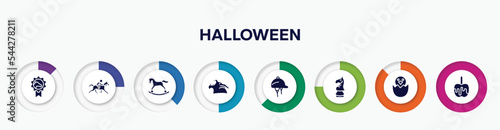 infographic element with halloween outline icons. included roach, dog resting, poison, dog shitting, birds home, hat for a jockey, egg with a crack, fangs vector.