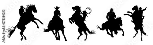 Cowboy riding horse black silhouettes set. Cowboy galloping with lasso, shooting from gun - Western traditional elements collection. Monochrome vector illustrations isolated