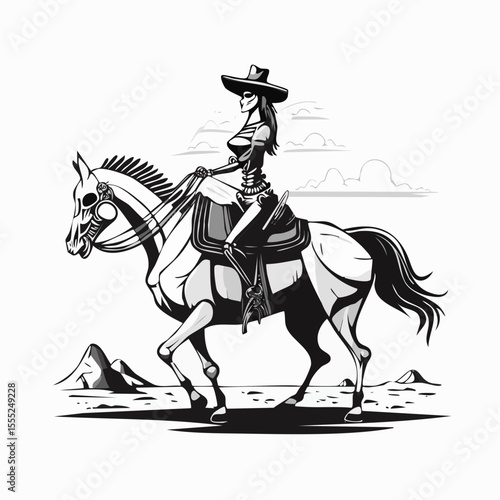 Cowboy Skull Riding a Skeletal Horse Across the Desert in a Western Vector Scene