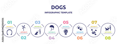 dogs concept infographic design template. included coffin, jockey hat, horse standing, lion face, null, mummy, pet hotel, dog shitting icons and 8 options or steps.