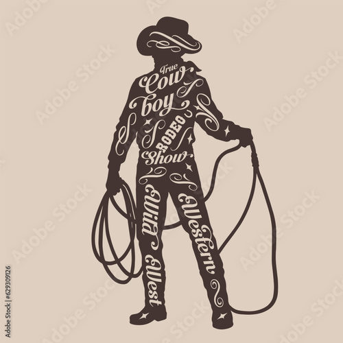 Emblem or banner for a Cowboy Rodeo show in retro style. Decorative vector illustration with cowboy hat and lettering. Suitable for poster, label, badge, icon, logo, flyer, invitation, t-shirt design