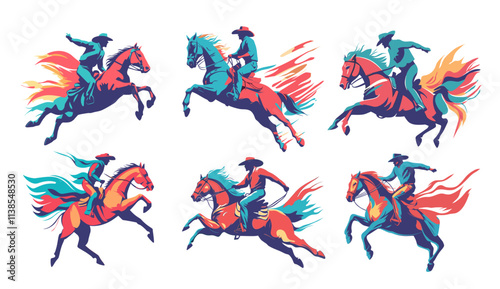 Cowboy rider cartoon concepts. Hat rope jumping horse cattle riding rodeo man horseman rural rancher country side character, isolated vectors on white background