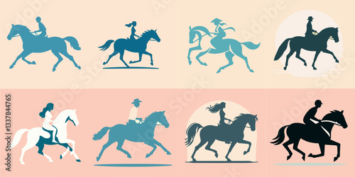 Silhouetted equestrian riders on horses in various styles and poses in a graphic representation