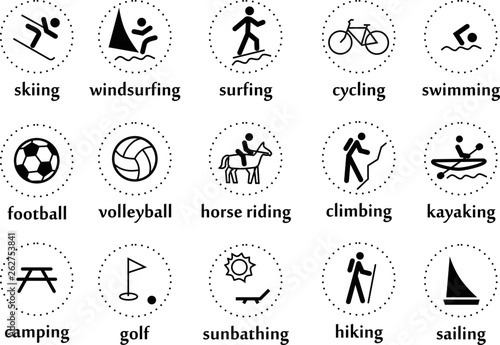 Collection of web icons representing various outdoor activities and travel modes including sailing, hiking, and cycling