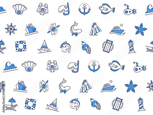 Set Carabiner, Fishing hook, Sleeping bag and Kayak or canoe on seamless pattern. Vector.