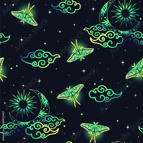 Vector seamless pattern with green moon moth and stars. Contemporary composition. Trendy texture for print, textile, packaging.
