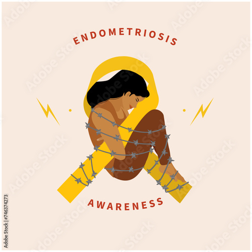 Woman entangled with yellow endometriosis ribbon and barbed wire