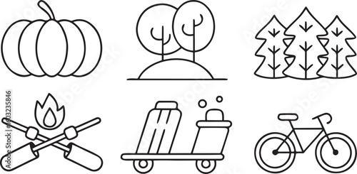 Community Cleanup Icons. Outline icon set of community cleanup day: group raking, leaf bagging, recycle truck, volunteer badge,