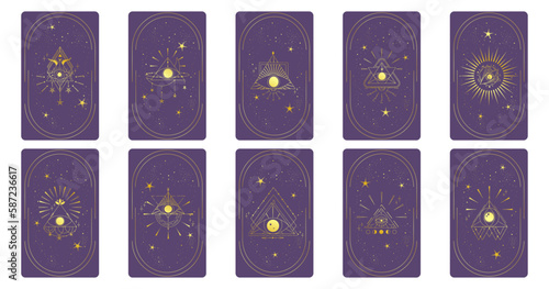 Tarot card gold set with mystic eye pyramid isolated. Boho esoteric tarot card with eye and star. Vector illustration. Sacred geometry celestial triangle
