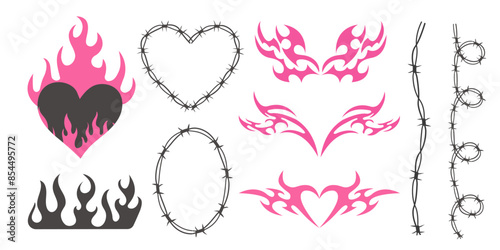 Y2k tattoo sticker set, Neo tribal aesthetic icon, gothic heart silhouette, butterfly, stars, fire. Love grunge groovy fashion print, acid ornament element collection, retro emo kit. Girly y2k sticker