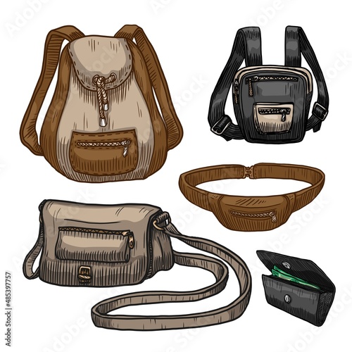 Hand drawn Vector Set of Backpacks. Cartoon Casual Backpack, cool backpack sketch . Backpacks Vector illustration.