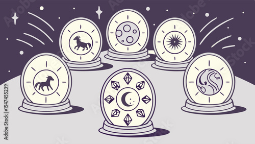 Mystical crystal ball silhouette set with magic symbols, meteor design, runes, plasma globe, and fortune-telling sphere illustration for fantasy or occult themes