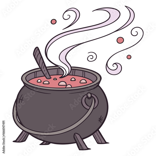 Collection of simple black outline icons for magic and sorcery themes, showing a bubbling potion, mortar and pestle, crystal ball, herbs, cauldron, and an ancient scroll
