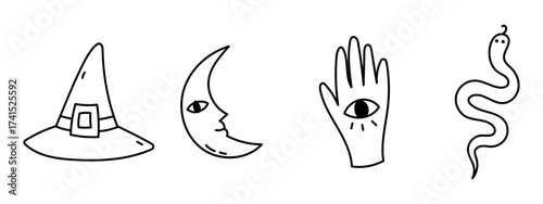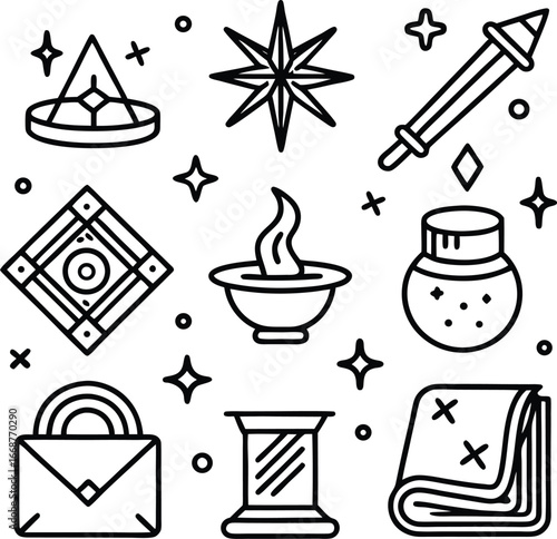 Magic themed linear icon set. featuring crystal ball, wand, spellbook, mirror, potion, scroll, amulet.